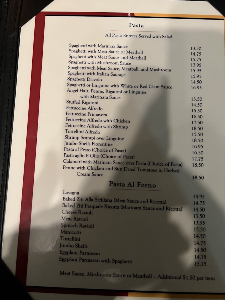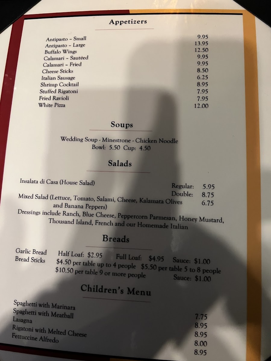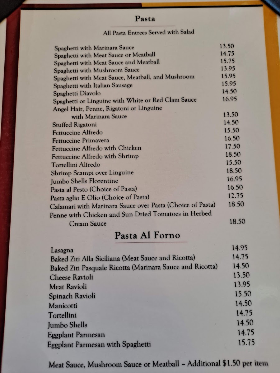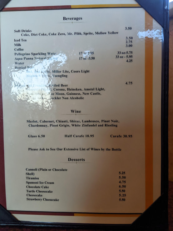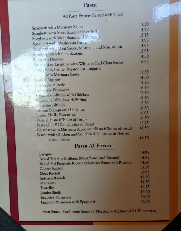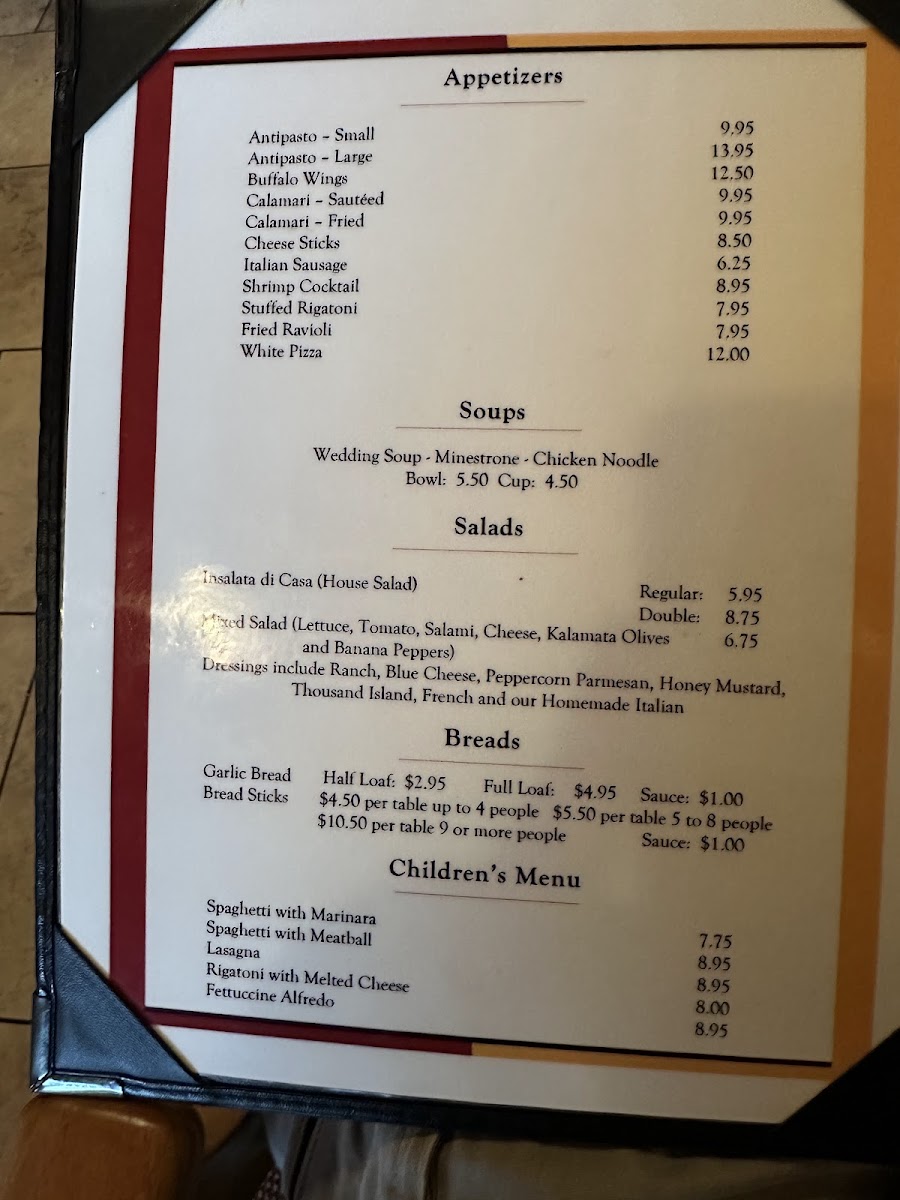 You’ll find a well-rounded selection of traditional Italian dishes, from house specialties like lasagna and spaghetti with meat sauce and meatballs to lighter options such as chicken Alfredo or veal Parmesan. Appetizers like fried calamari and shrimp cocktail are perfect for sharing, while the pasta choices offer satisfying portions crafted with simple, approachable flavors.